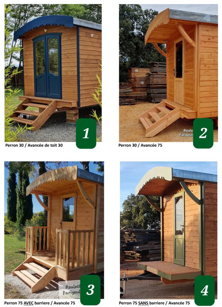 Voici un exemple rassemblant diverses options : bandeau avant simple, perron 75 et avancée de 75 sans barrière, timon à l’avant avec roue jockey, finition saturateur 2 tons (gris et naturel).