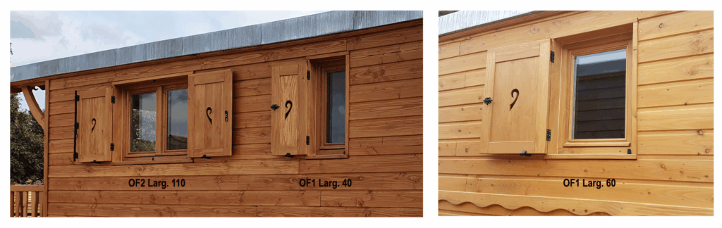 - Nos fenêtres et volets : en douglas, double vitrage 4/16/4 et joint d’étanchéité. Trois dimensions disponibles : 2 vantaux (OF2) en largeur 110 cm, 1 vantail (OF1) en largeur 40 cm ou 60 cm.