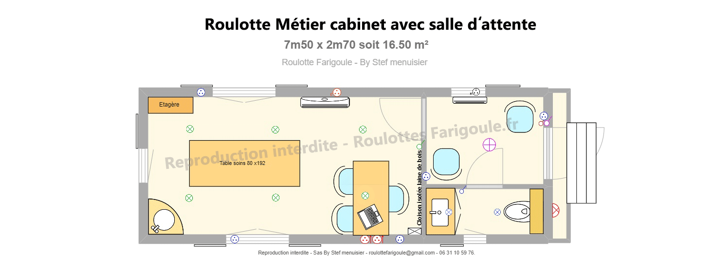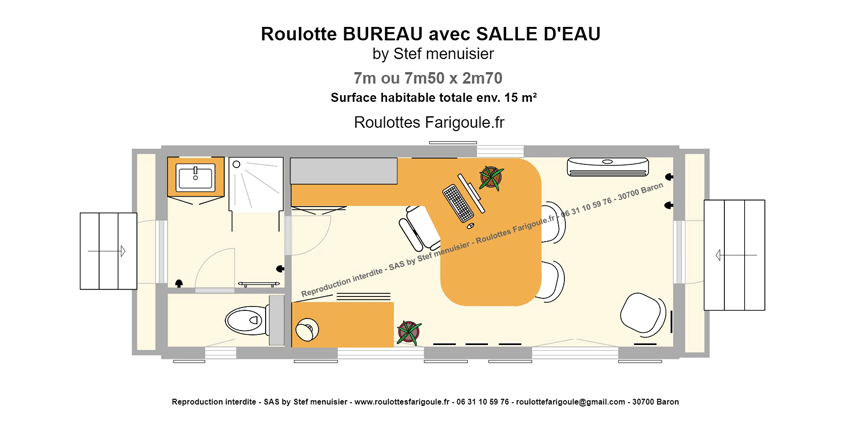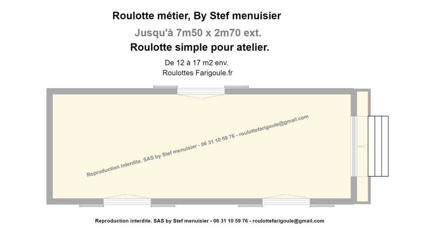 Tous les plans ci-dessous sont des exemples d’aménagement pour vous permettre d’apprécier les capacités de nos roulottes. Nous construisons uniquement à la commande pour nous adapter à vos besoins. Nous pouvons modifier la largeur et la longueur de nos roulottes de 2m20 à 2m70 de large et de 3m50 à 7m50 de long, maximum total extérieur. Il est également possible d’ajouter, enlever, déplacer les fenêtres, les prises électriques. Nos roulottes peuvent être conçues soit en hors d’eau/hors d’air, soit en modèle simple (vide) ou encore avec tout ou partie de l’agencement intérieur.