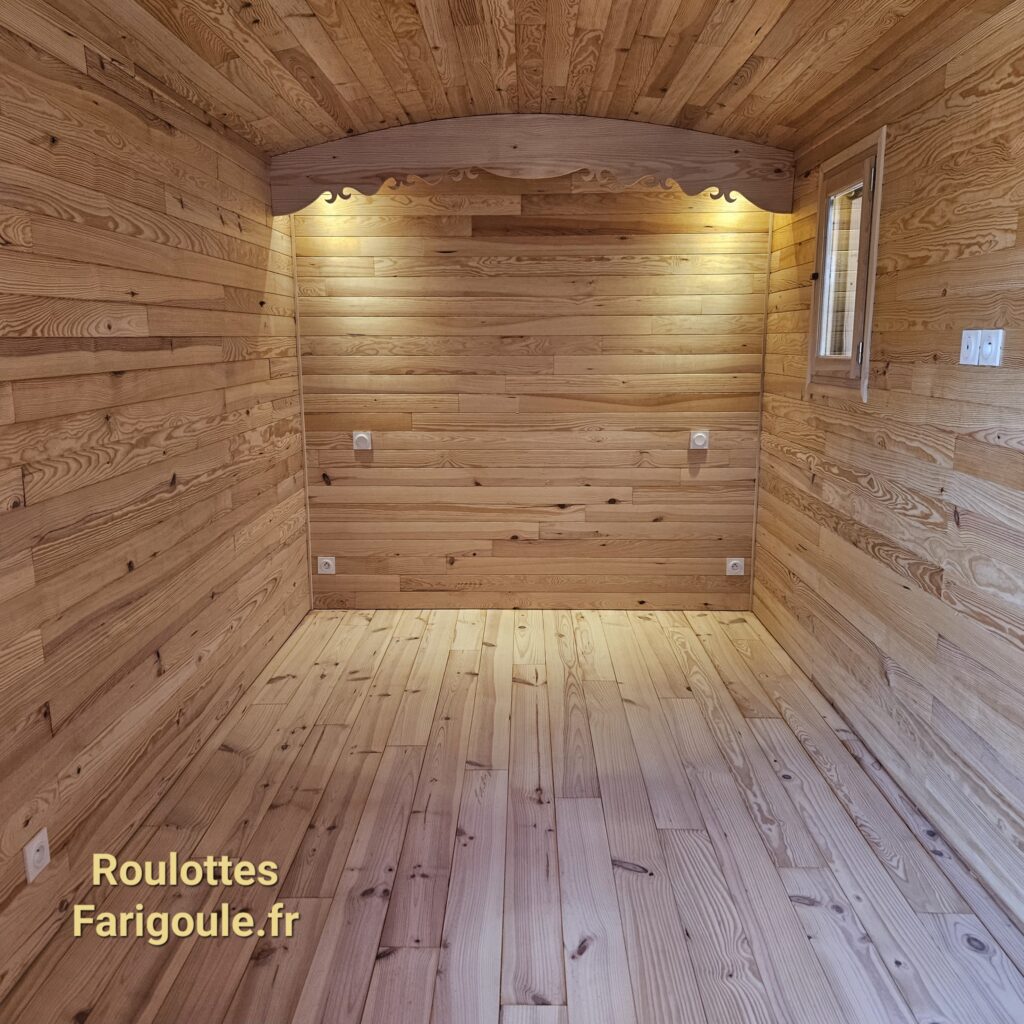 - Parement intérieur murs, plafond : lambris pin noueux, au sol : parquet en pin.